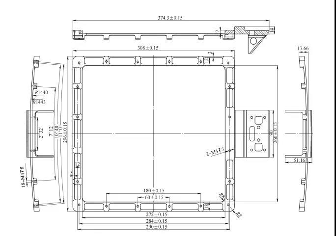 框架零件材料為TC4 鈦合金,其結(jié)構(gòu)及尺寸如圖2所示,長 374 . 3mm 、寬 296mm 、厚51.16mm,是我公司最大的鈦合金零件。其壁厚最薄處為3mm,外形為R1 443mm大圓弧曲面,形狀復(fù)雜。鈦合金本身為難加工材料,整體加工容易變形,而且費用很高,加工周期長,影響產(chǎn)品交貨周期。原加工工藝的難點在于零件變形的控制,以及加工周期長、材料利用率低和加工費用高等問題。