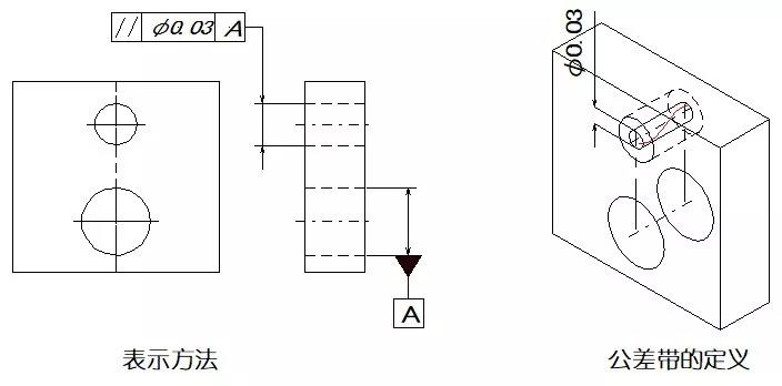 示例:如公差值前加注記號Φ、則公差帶為基準(zhǔn)平行直徑Φ0.03mm的圓柱面內(nèi)。