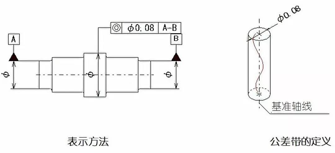 示例:公差值加注記號時(shí),公差帶是直徑0.08mm的圓柱之間區(qū)域。圓形公差帶的軸線與基準(zhǔn)一致。